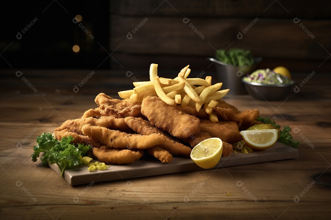 Tiras de peixe frito crocante com batatas fritas na mesa de madeira rústica
