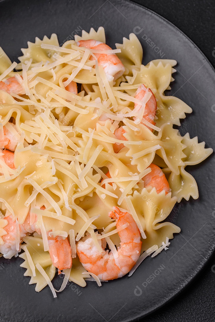 Deliciosa massa farfalle com camarão lagostim com molho cremoso e queijo sobre fundo escuro de concreto