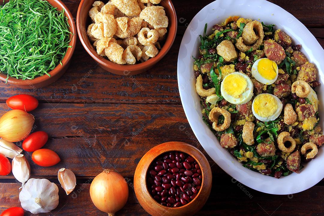 Feijão Tropeiro prato típico da culinária brasileira, feito com feijão, bacon, linguiça, couve, ovos