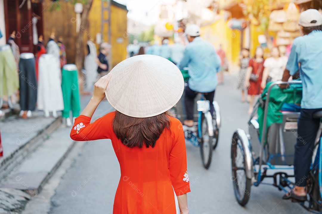 Mulher feliz usando vestido vietnamita Ao Dai, viajante asiático pa...