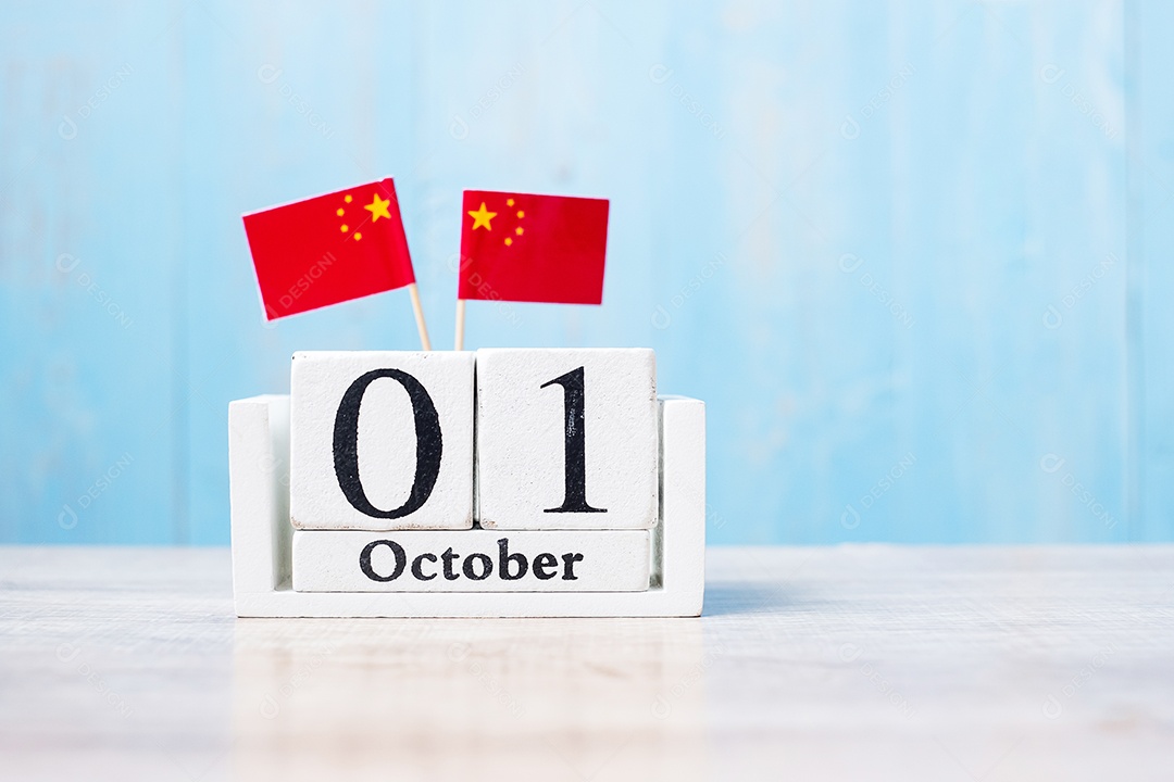 Calendário de madeira de 1º de outubro com bandeiras em miniatura da China. Dia Nacional da República Popular da China, feriado público da nação e conceitos de celebração feliz