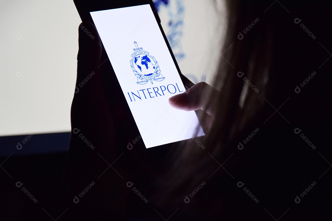 Mulher segurando celular com logotipo da Interpol exibido na tela