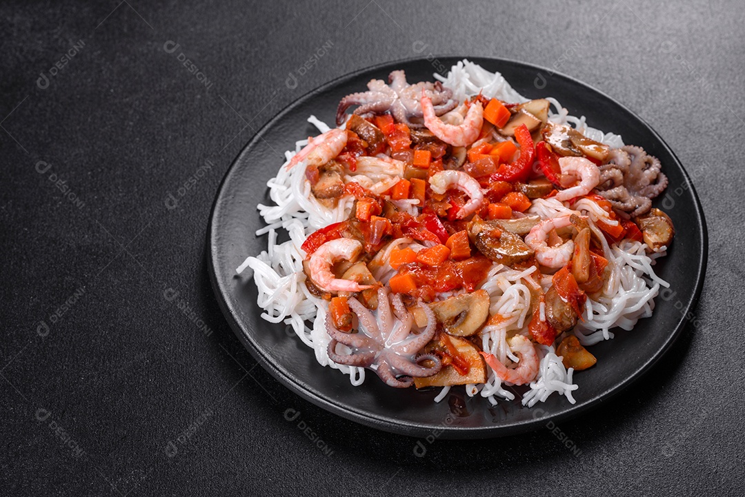 Macarrão de arroz saboroso com tomate, pimenta vermelha, cogumelos e frutos do mar em um fundo escuro de concreto