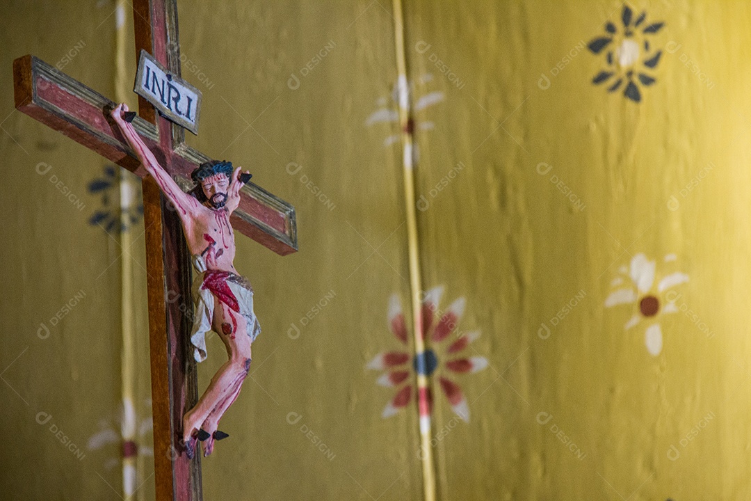 Foto de Jesus Cristo na cruz de madeira.