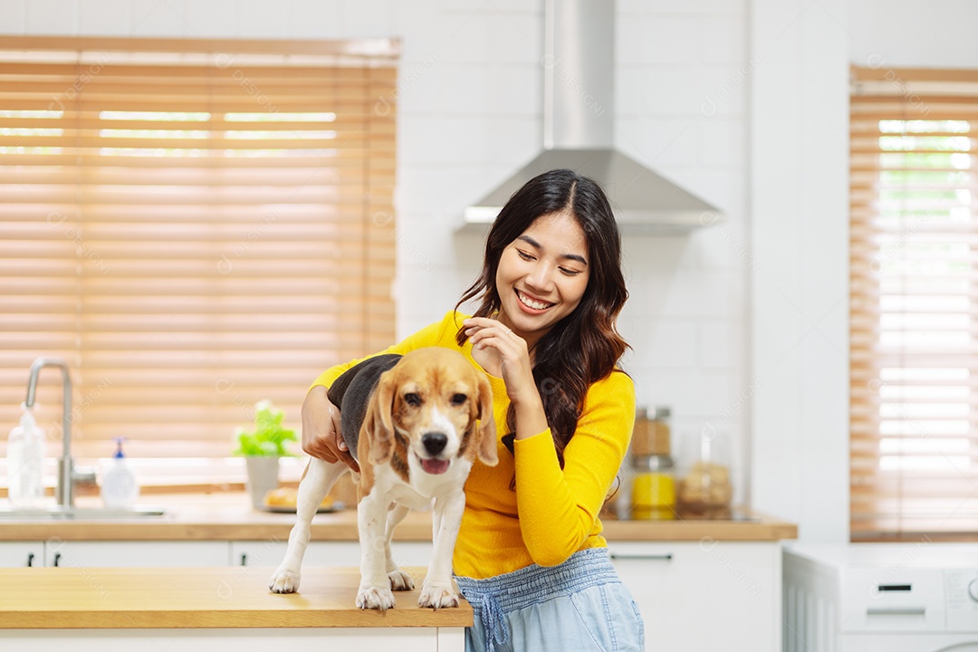 Mulher asiática feliz desfrutando de seu cão de estimação em casa