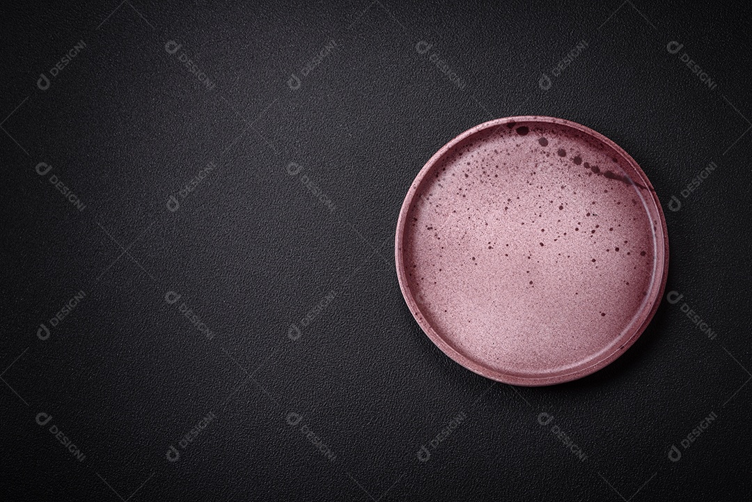 Placa cerâmica vazia e acidentada em um fundo de concreto texturizado. Utensílio de cozinha