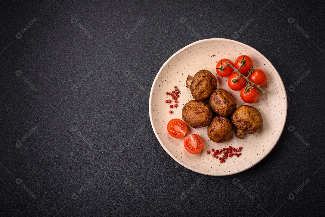 Deliciosos champignon inteiros e suculentos assados ​​na grelha com sal e especiarias em uma placa de cerâmica sobre um fundo escuro de concreto
