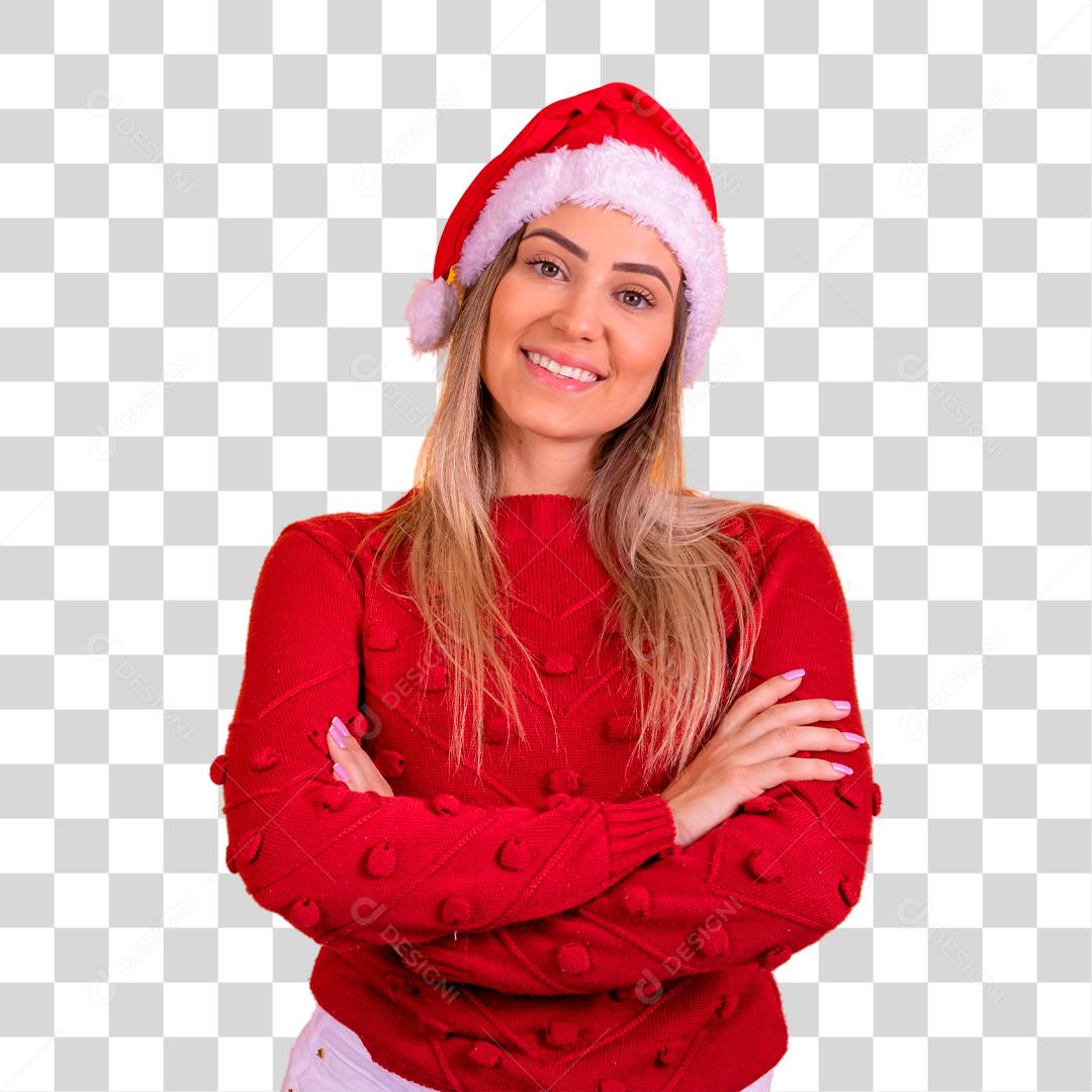 Mulher loira sorridente com um chapéu de papai noel com os braços cruzado