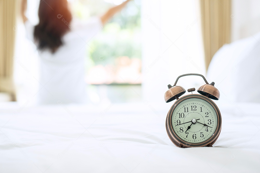 Despertador fechado com fundo de mulher feliz se esticando