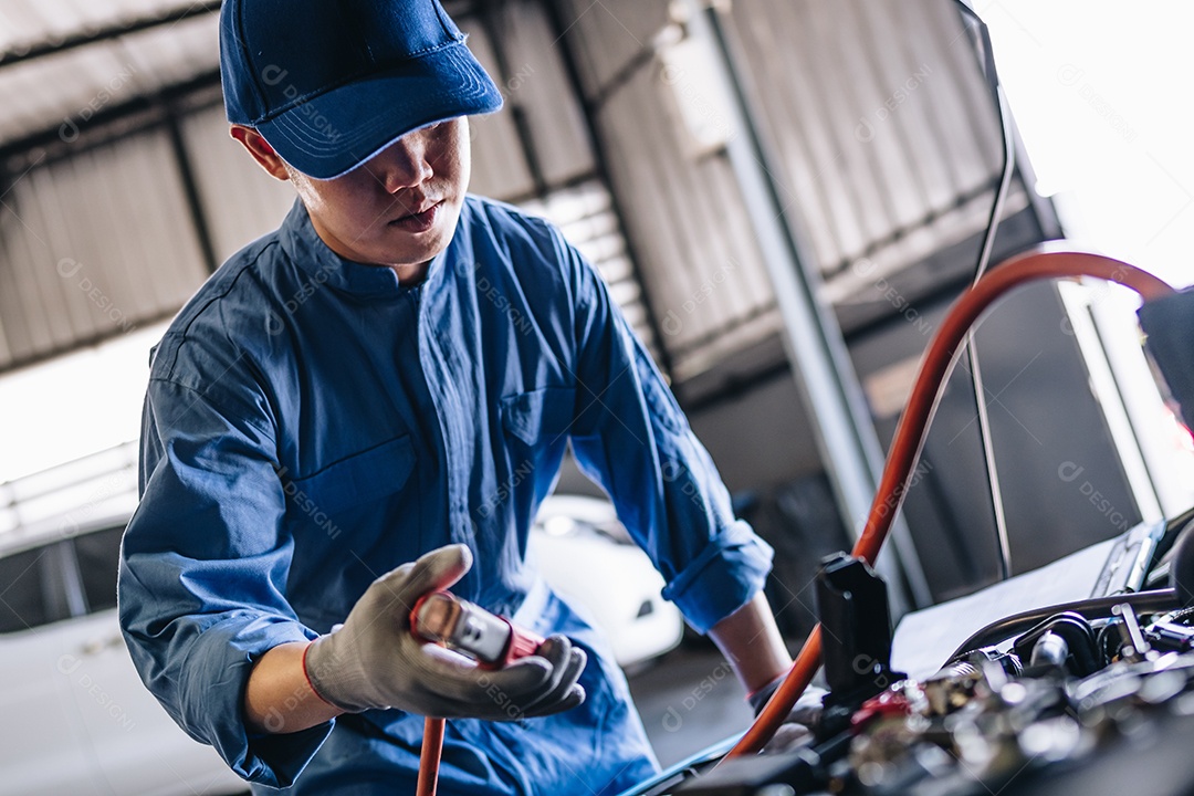 Trabalhador de manutenção que verifica o serviço de pneus através do sistema de seguro na garagem