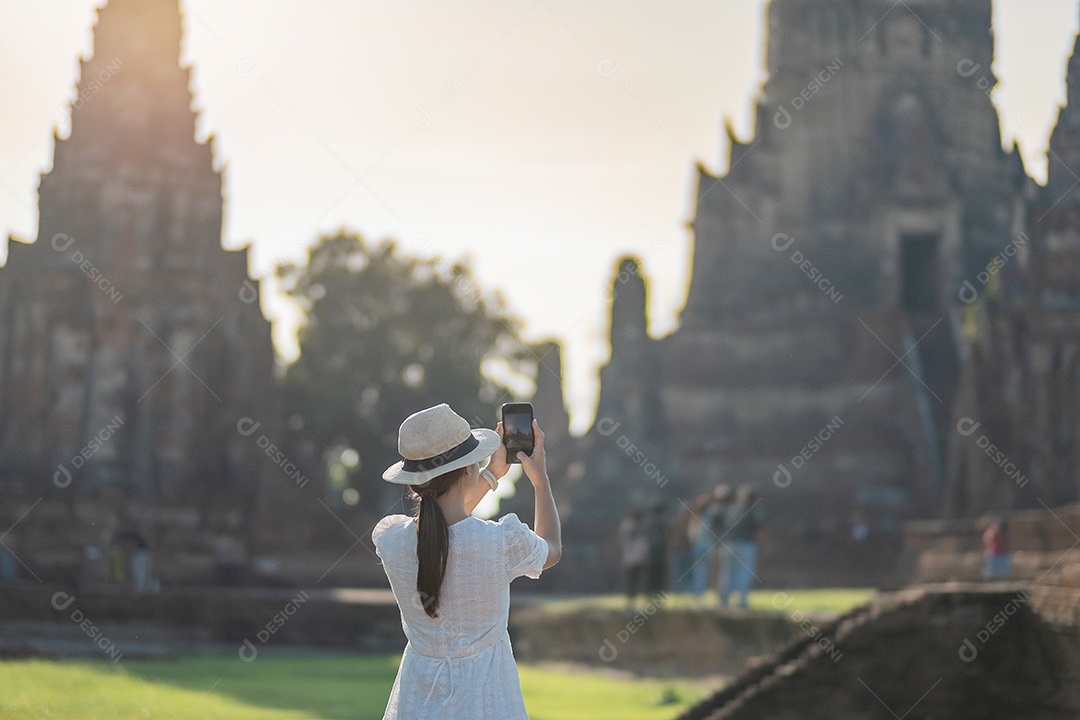 Mulher turista feliz em vestido branco tirando foto pelo smartphone...