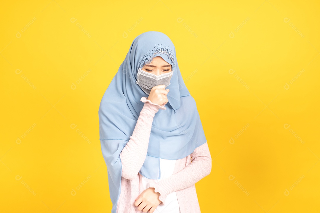 Retrato de menina muçulmana asiática em hijab usando máscara facia em fundo amarelo