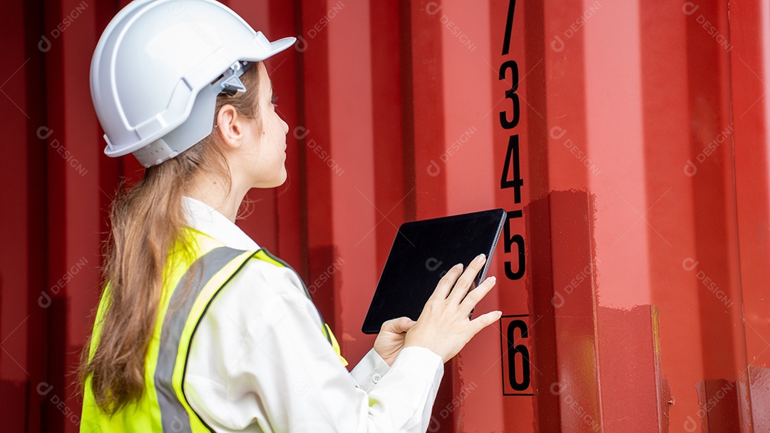 Gerente de mulher usando tablet para verificar o código do contêiner de carga.