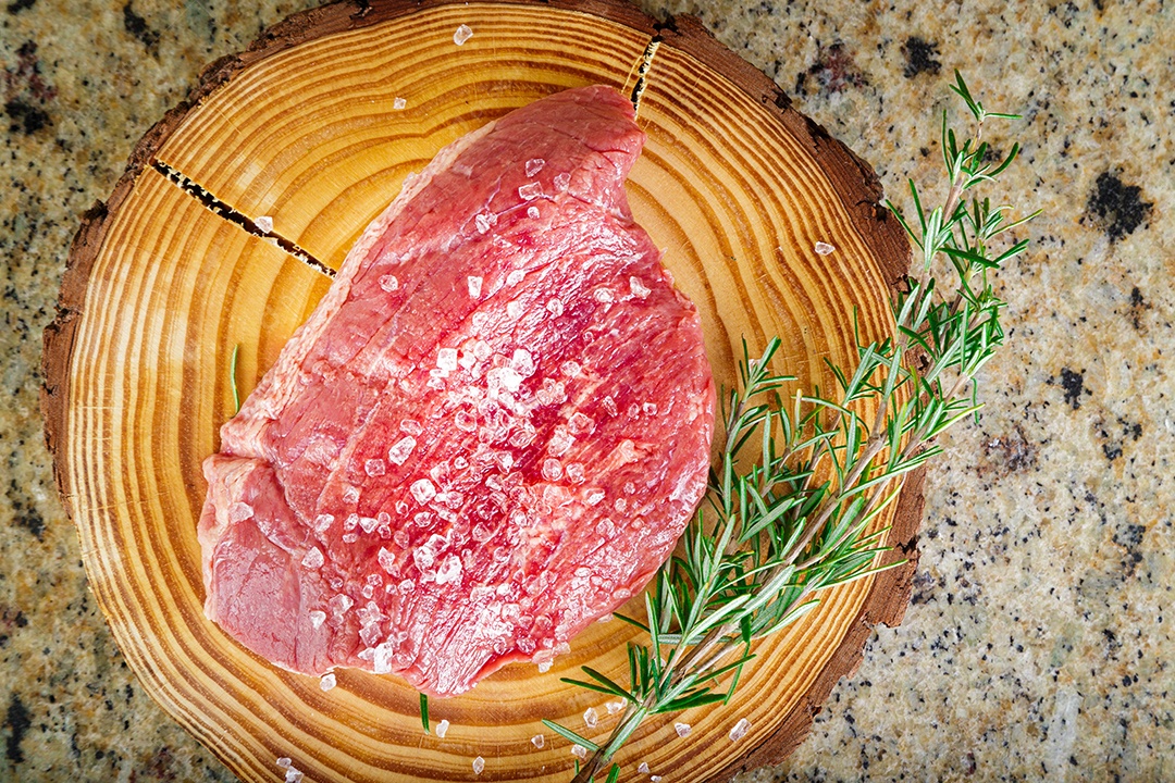 Bife de picanha cru em fundo de madeira em estilo rústico.