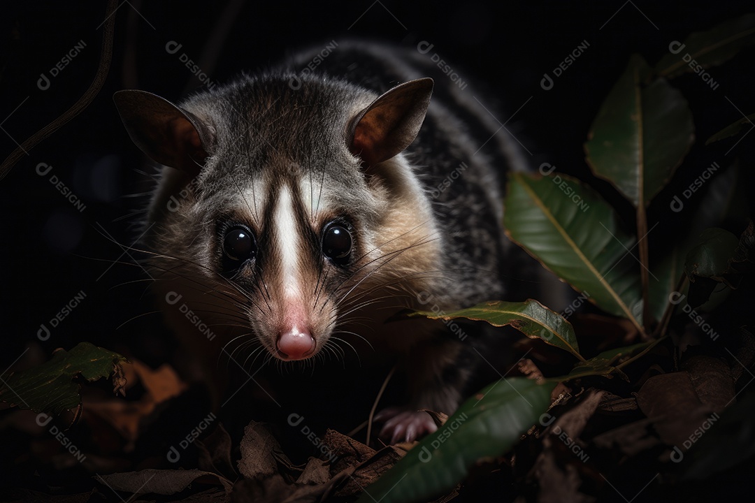 Curioso gambá sob a lua, exibe listras e olhos brilhantes.
