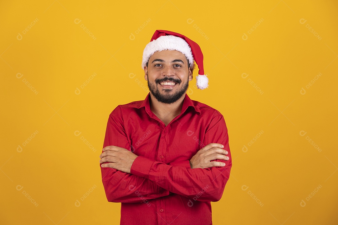 Homem bonito vestido para o natal com chapéu de papai Noel.