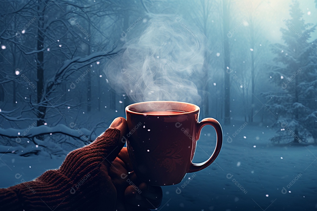 Uma imagem aconchegante com uma mão segurando uma xícara de café fumegante, tendo como pano de fundo vibrante uma floresta de inverno