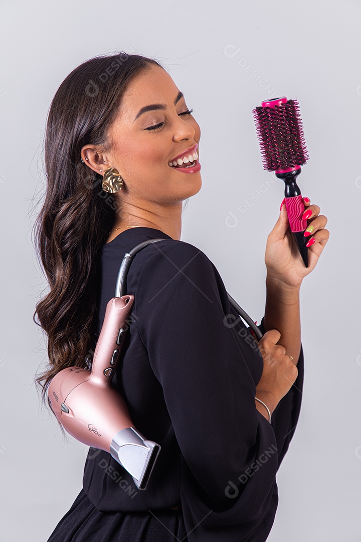 Linda mulher bonita jovem segurando escova e secador sobre fundo is...