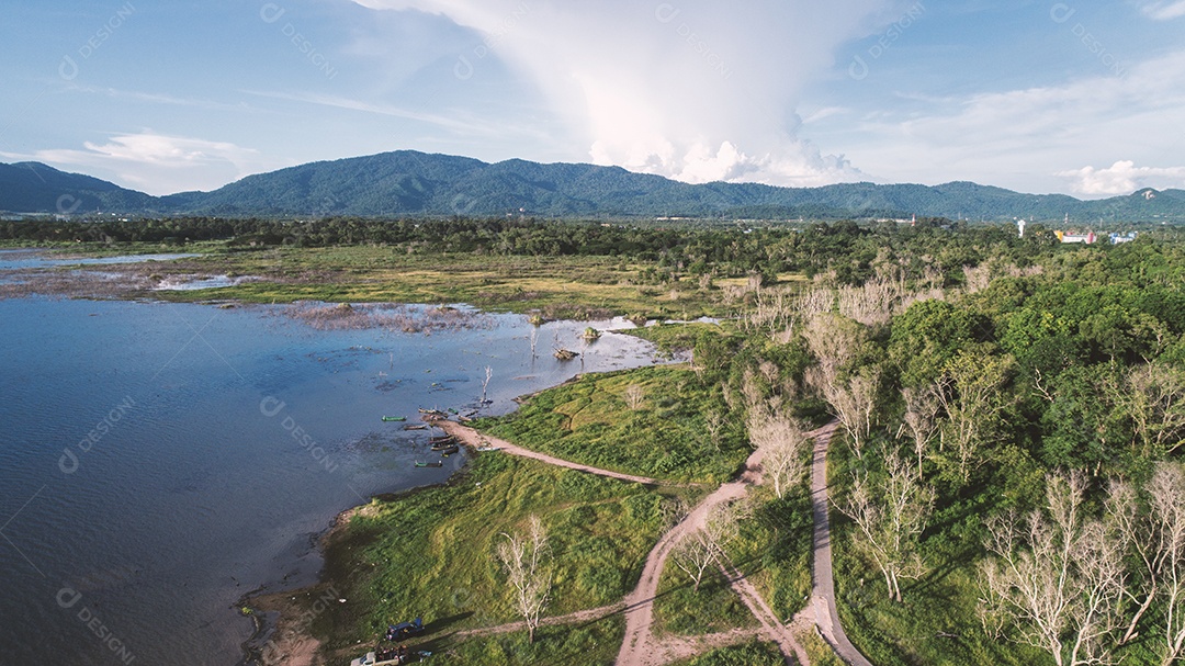 Vista aérea do lago ao longo da floresta por drone. Tema paisagem e...