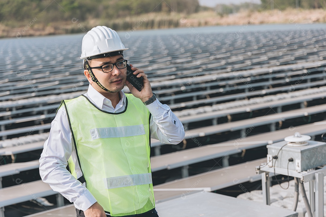 Homem profissional de placas fotovoltaicas com capacete de segurança