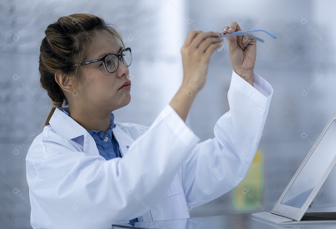 Mulher asiática vestindo vestido de chão branco verificando óculos com um rosto pensativo, optometrista verificando óculos, conceito de cuidados com os olhos.