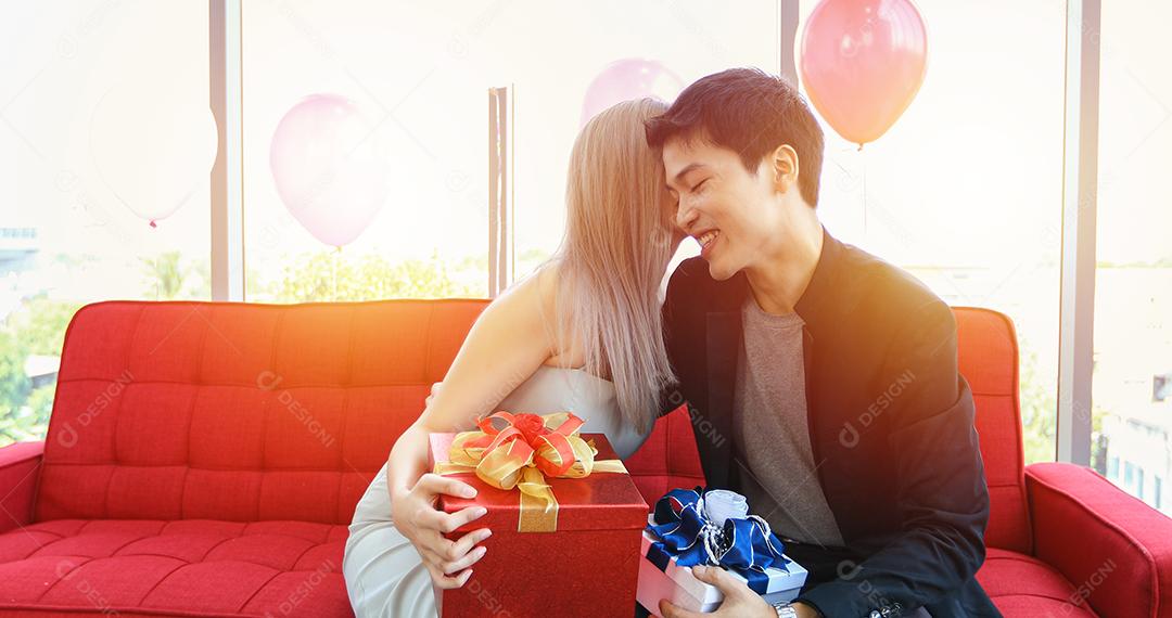 Amante de casal asiático está dando uma caixa de presente com prese...