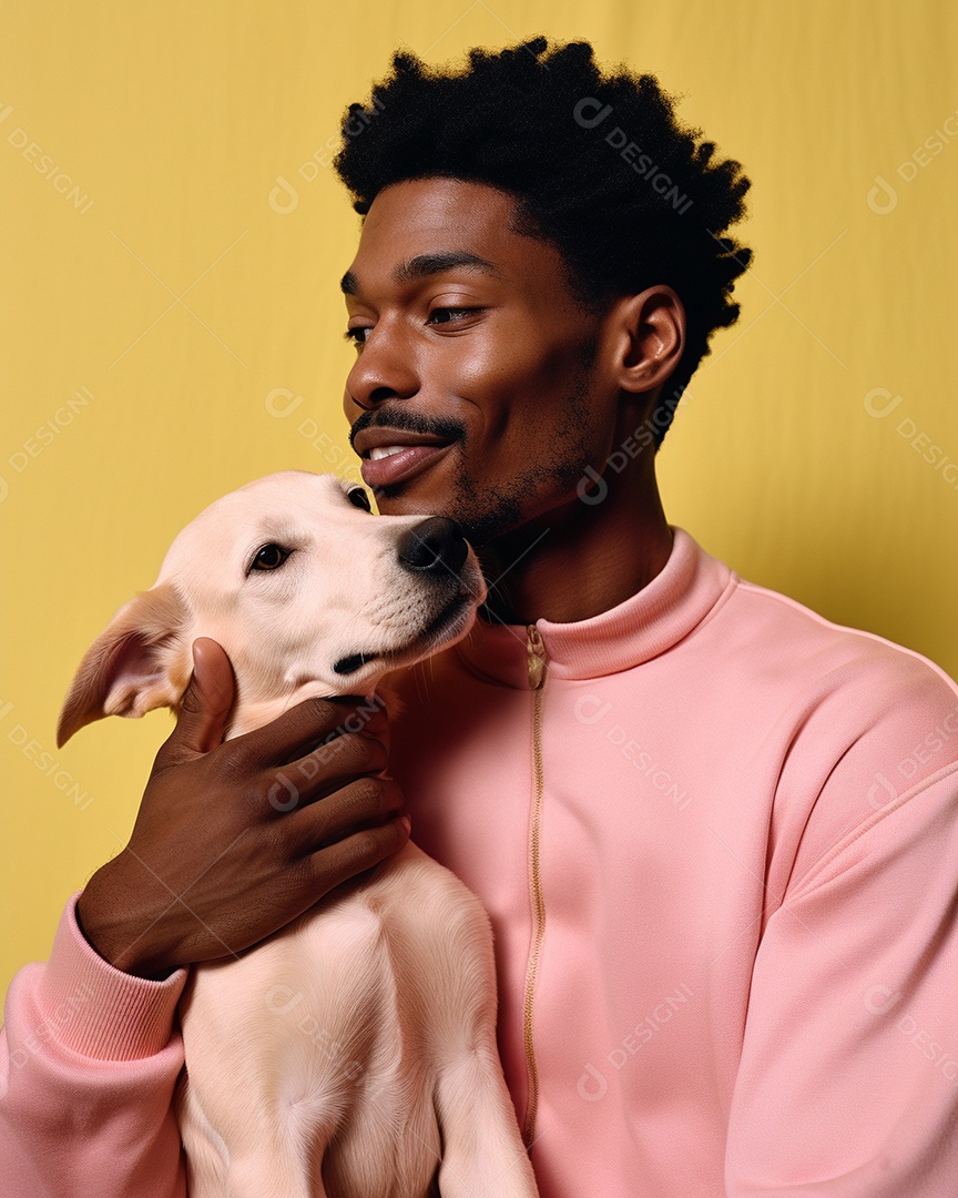 Homem negro com seu cachorro acariciando seu cachorro em um fundo colorido
