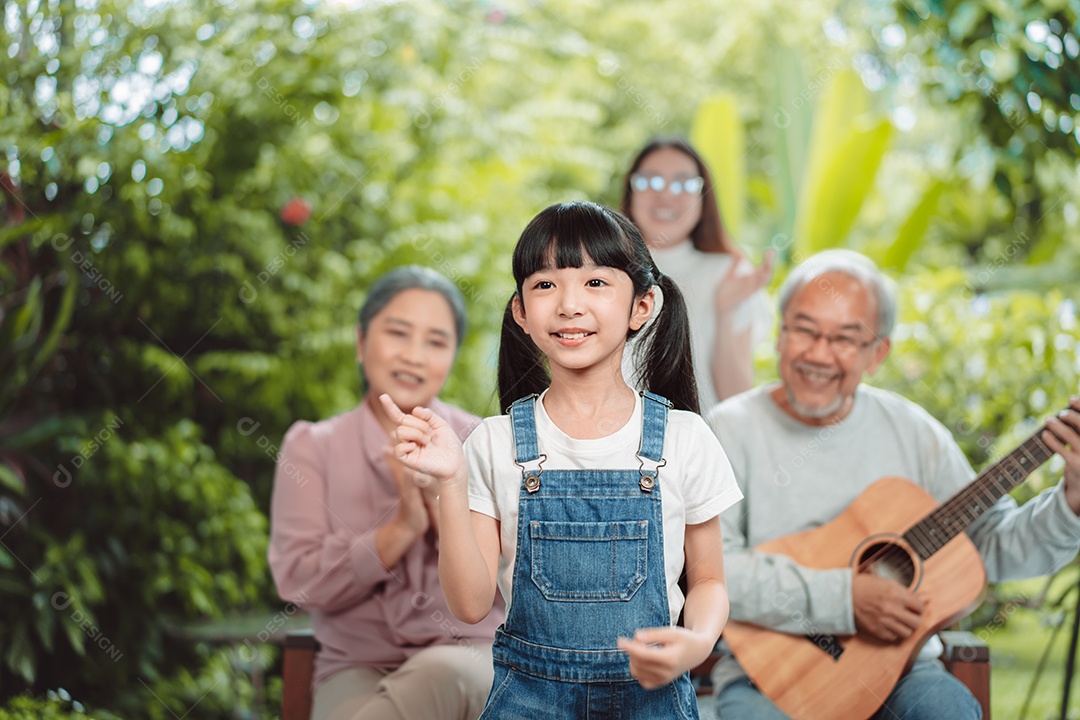 Família feliz asiática sorrindo fica em casa fora do quintal.