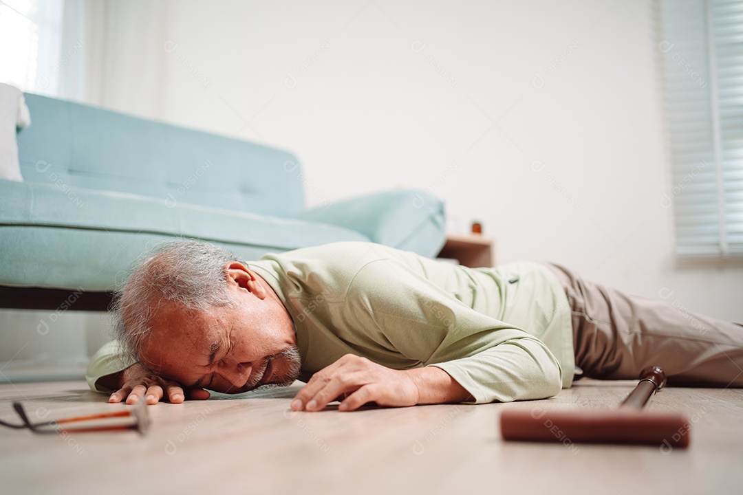 Homem sênior asiático caindo no chão com bengala na sala de estar e...