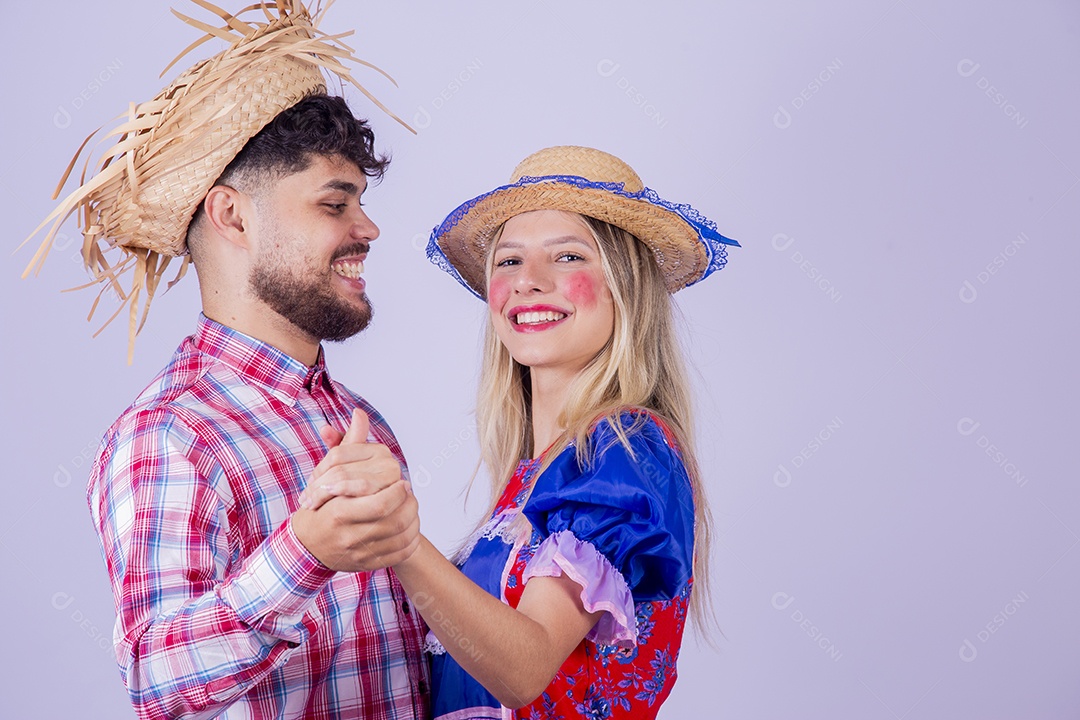 Lindo casal usando roupas típicas festa juninas sobre fundo isolado