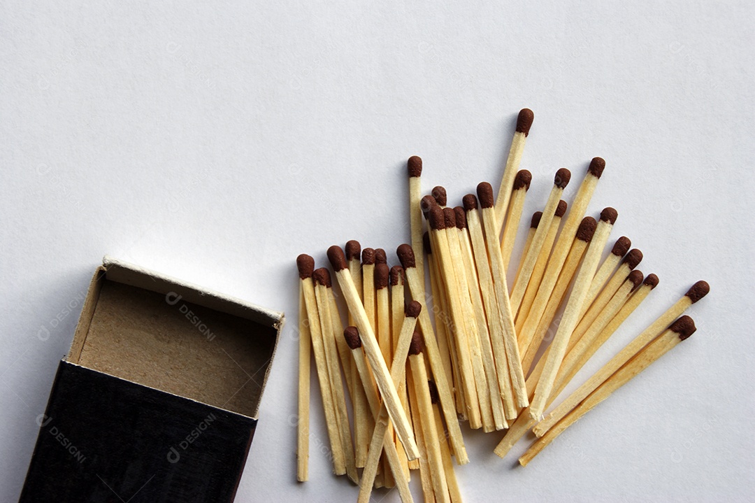 Fósforos de madeira espalhados ao lado de uma caixa de fósforos de ...