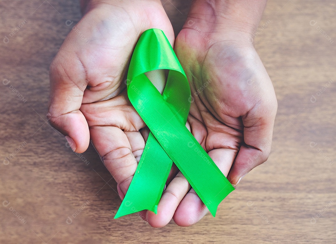 Fita verde colocada nas mãos de humanos Dia Mundial da Saúde Mental