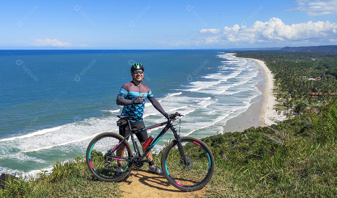 Mountain biker andando de bicicleta em montanhas e praia Aptidão