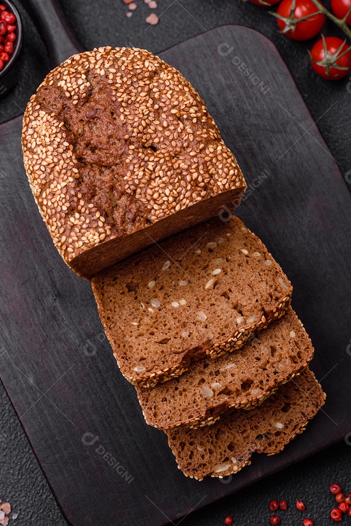Delicioso pão integral crocante fresco com sementes e grãos sobre um fundo escuro de concreto