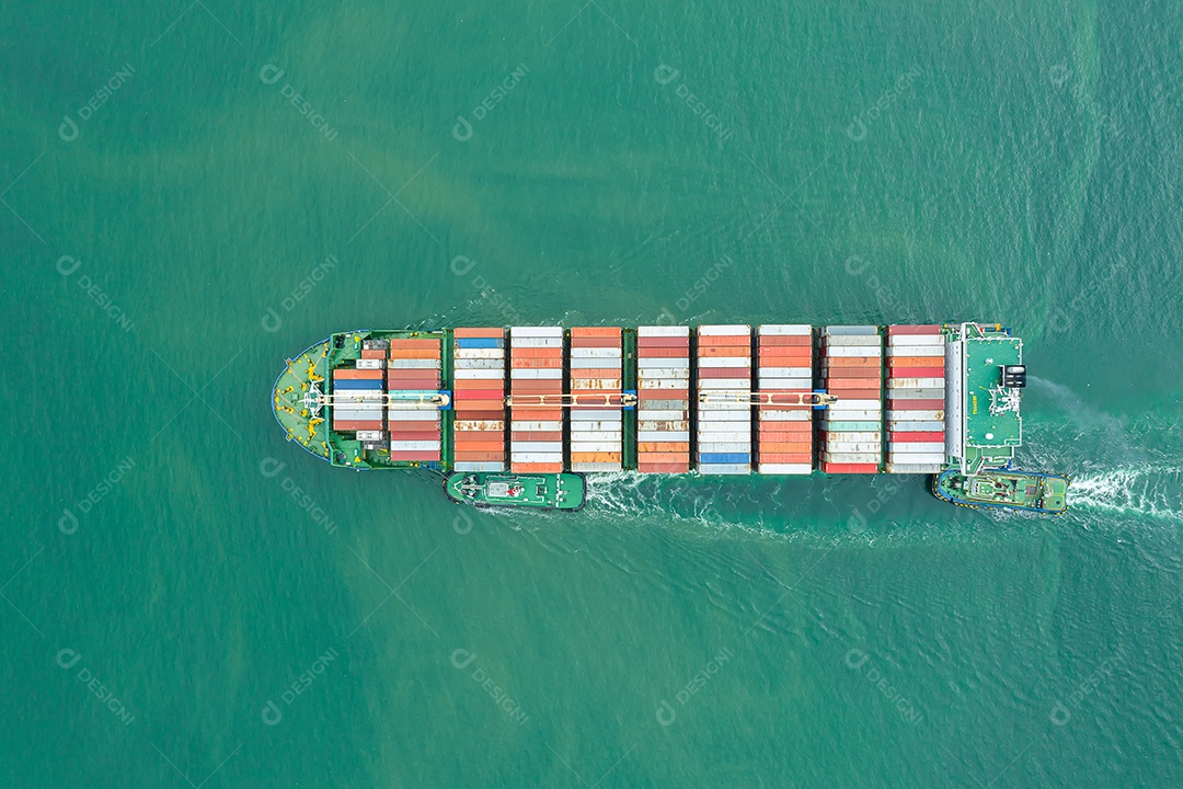 Vista aérea superior do navio de carga transportando contêineres para mercadorias de exportação de importação para o cliente, conceito logístico e cadeia de suprimentos.