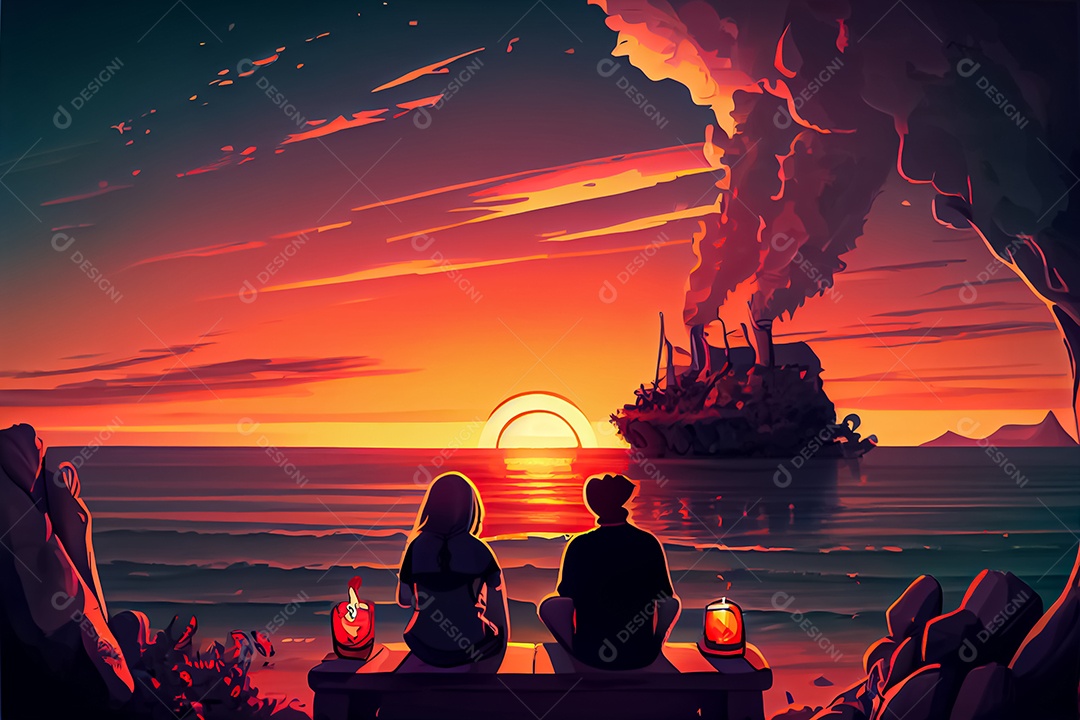 Casal masculino e feminino dos desenhos animados, observando o céu ao entardecer