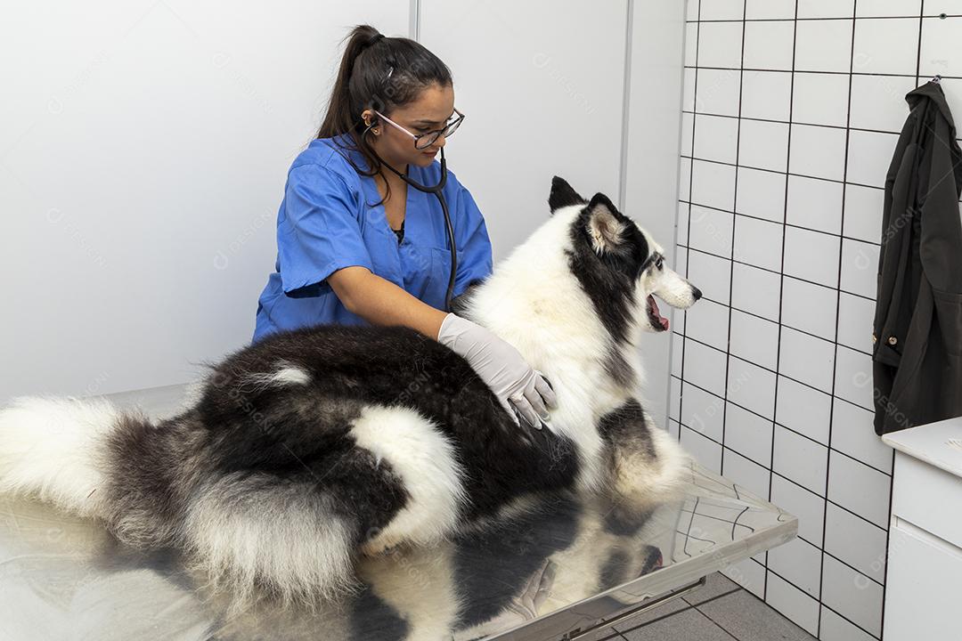Veterinário hispânico examinando um cão husky siberiano Imagem JPG