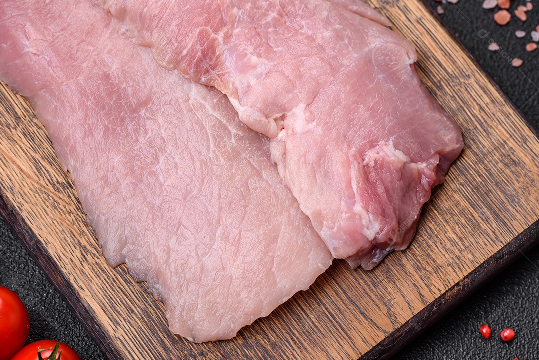 Um pedaço de carne de porco crua fresca e suculenta com sal, especiarias e ervas sobre um fundo escuro de concreto
