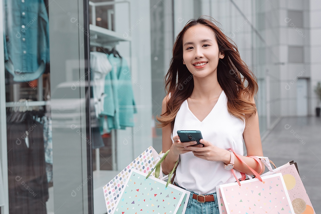 Linda mulher asiática usa smartphone e segura uma sacola de compras