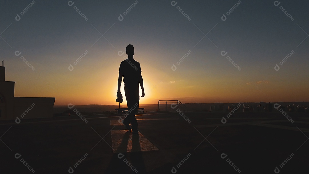 Silhueta de fotógrafo de homem ao pôr do sol