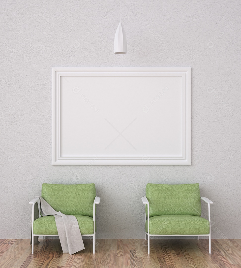 Molduras para fotos de maquete de ilustração 3D na parede da sala de estar, interior de estilo escandinavo com conceito de decoração de móveis aconchegante, renderização