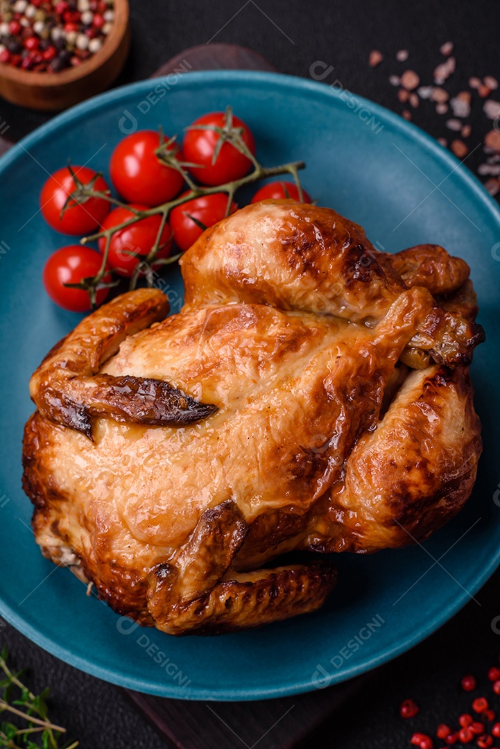 Frango assado inteiro delicioso e crocante com legumes, sal e especiarias sobre um fundo escuro de concreto