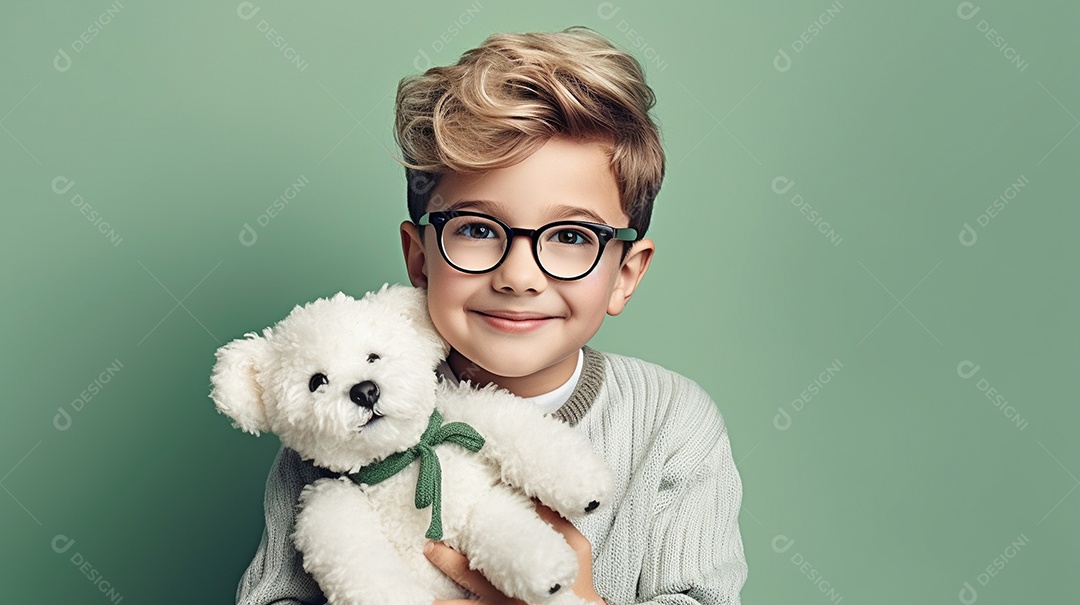 Garoto branco em roupas casuais se diverte, abraça o ursinho de pel...