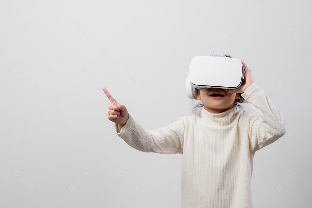 Menina asiática com fone de ouvido de realidade virtual. tecnologia...