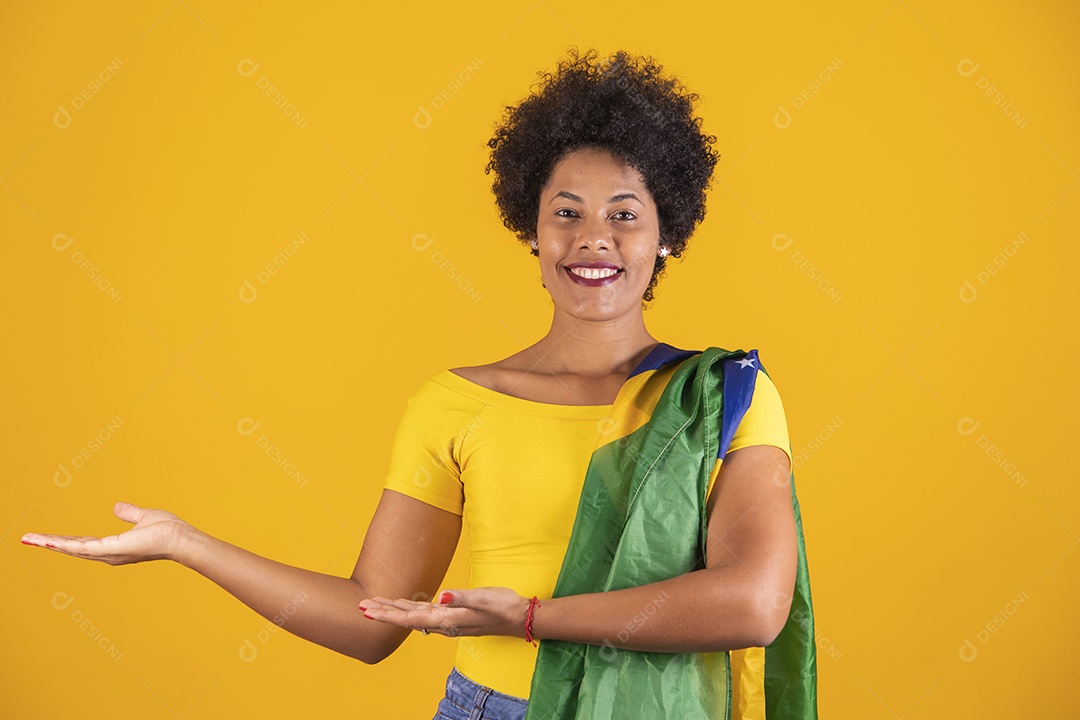 Torcedora brasileiro. Fã de mulher brasileira comemorando no futebol ou partida de futebol