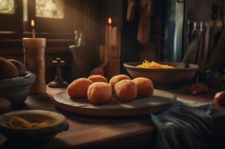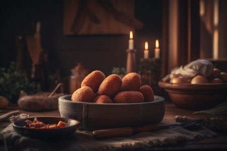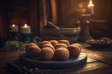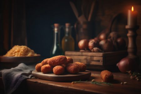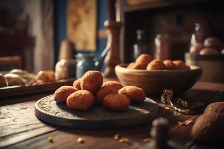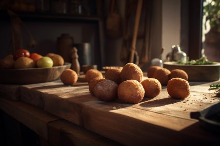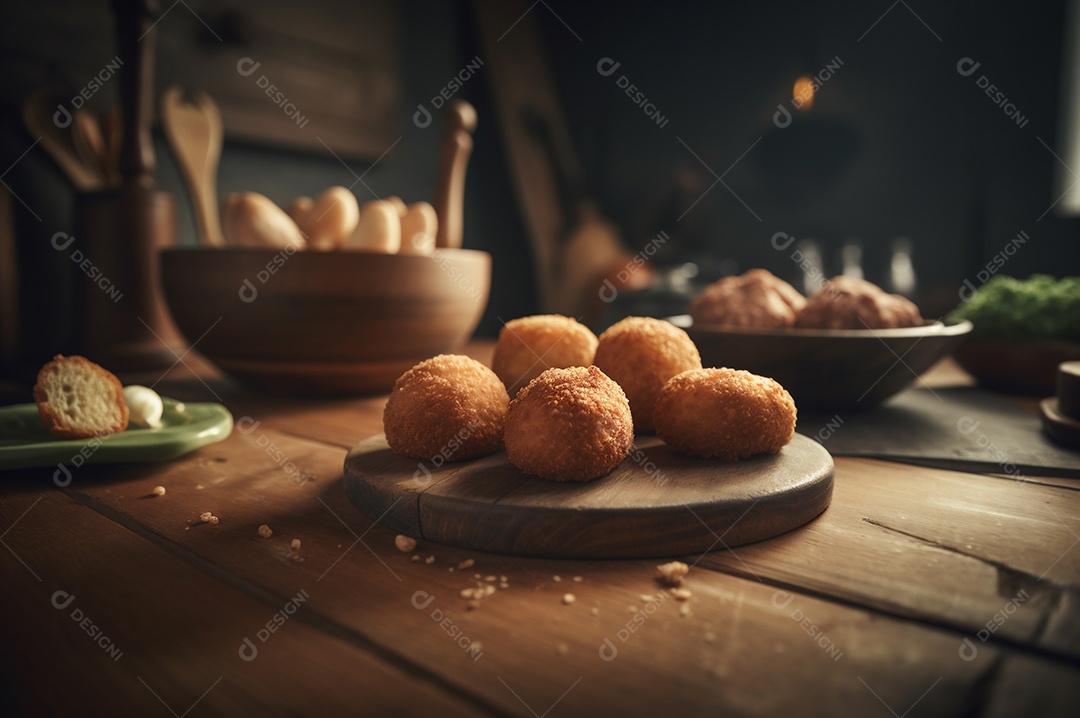 Deliciosos croquetes caseiros na mesa de madeira no fundo da cozinha rústica