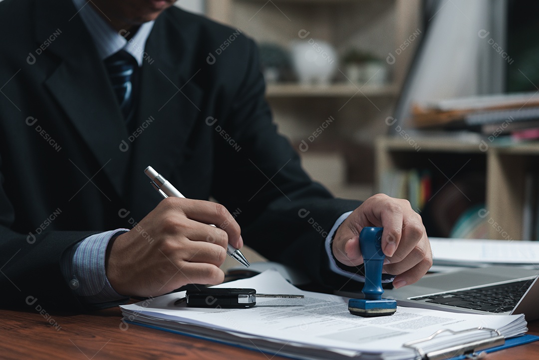 Empresário assinando contrato de compra ou venda de carro.Serviço d...