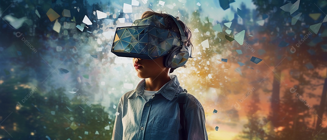 Garotinho ou adolescente usando fone de ouvido VR de realidade virtual para entrar em outro mundo. conceito de jogo futurista.