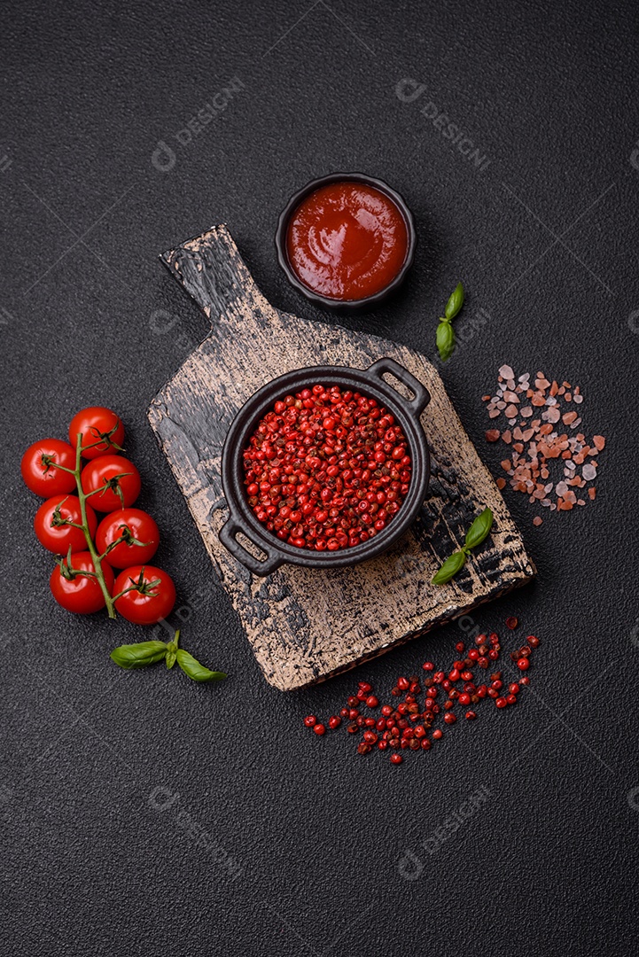 Especiarias, ervilhas de pimenta da Jamaica na cor vermelha ou rosa em uma tigela sobre um fundo preto de concreto. Cozinha asiática