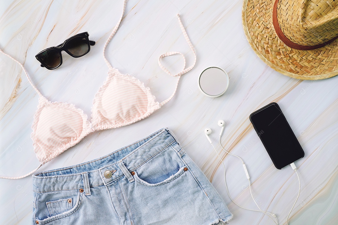 Postura plana de itens de verão com biquíni pastel, óculos de sol
